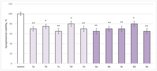 Substances 7a, 7e, 8b, and 8c statistically significantly decreased synaptosomal viability by 30%; 7c, 8a, and 8e decreased by 35%; 7b—by 25%; and 7d and 8d—by 20% compared to the control.