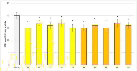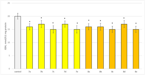 Substances 7a, 8a, and 8b decreased GSH level statistically significantly by 20%; 7b, 7d, and 8d decreased by 15%; 7c, 7e, 8c, and 8e—by 25% compared to the control.