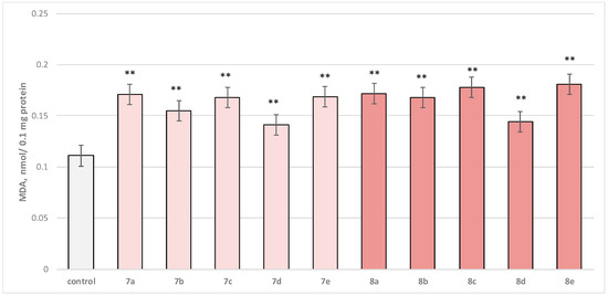 Substance 7a increased MDA production statistically significantly by 63%; 7b increased by 43%; 7c—by 53%; 7d—by 34%; 7e—by 50%; 8a—by 60%; 8b—by 52%; 8c—by 66%; 8d—by 40%; and 8e—by 69% compared to the control.