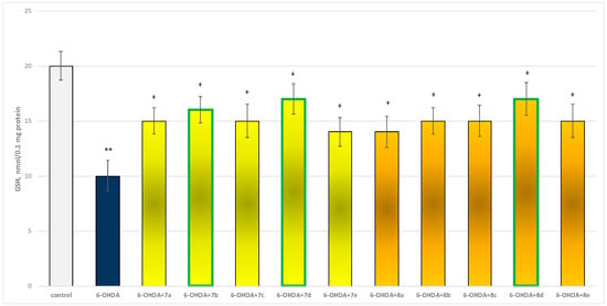 Substances 7a, 7c, 8b, 8c, and 8e statistically significantly preserved GSH levels by 50%; 7e and 8a preserved by 40%; 7b—by 60%; and 7d and 8d—by 70%, compared to the toxic agent (6-OHDA).