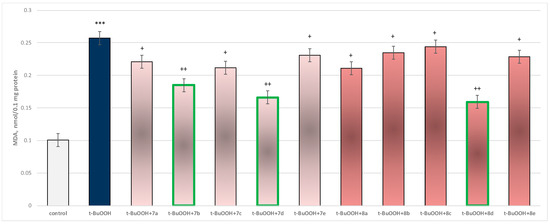 Substance 7a reduced MDA production statistically significantly by 14%; 7b reduced by 28%; 7c—by 18%; 7d—by 35%; 7e—by 10%; 8a—by 18%; 8b—by 9%; 8c—by 5%; 8d—by 38%; and 8e—by 11%, compared to the toxic agent (t-BuOOH).