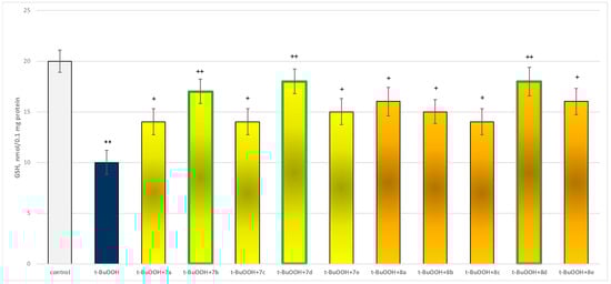 Substances 7a, 7c, and 8c preserved GSH levels statistically significantly by 40%; 7b preserved by 70%; 7d and 8d—by 80%; 7e and 8b—by 50%; and 8a and 8e—by 60%, compared to the toxic agent (t-BuOOH).