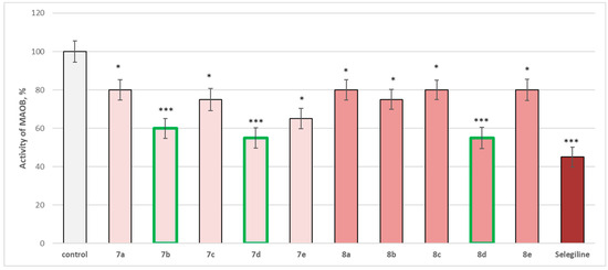 The whole series of newly synthetized compounds, evaluated at 1 µM concentration, revealed statistically significant inhibitory effect on human recombinant MAOB enzyme (hMAOB), with 7a, 8a, 8c, and 8e inhibiting hMAOB with 20%; 7c and 8b—inhibiting with 25%; and 7e—with 35%, compared to the control (pure hMAOB) (Figure 15).