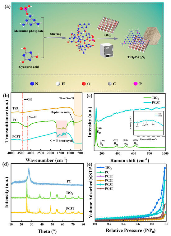 (a) Schematic illustration of PC3T, (b) FTIR spectra, (c) Raman spectra, (d) XRD patterns, and (e) N2 adsorption–desorption isotherms of various samples.