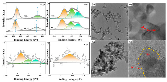 (a) Ti 2p and (b) O 1s spectra of TiO2 and PC3T; (c) N 1s and (d) P 2p spectra of PC3T; and TEM images of (e,f) TiO2 and (g,h) PC3T.