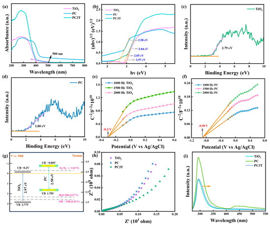 (a) UV-Vis DRS and (b) bandgap energy spectra of the samples; (c,d) valence band spectra of TiO2 and PC3T; Mott–Schottky plots of (e) TiO2 and (f) PC3T; (g) band structures of TiO2 and PC; and (h) EIS plots and (i) PL spectra of samples.