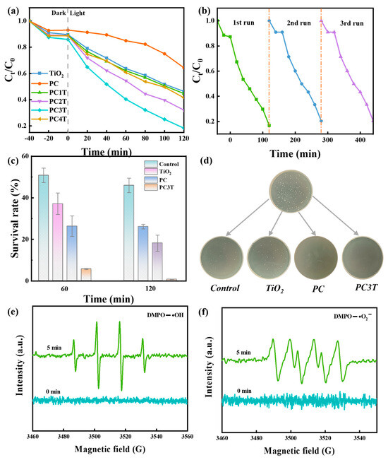 (a) Photocatalytic degradation of MB for various samples; (b) stability of PC3T for the photocatalytic degradation of MB; (c) photosensitive antimicrobial survival and (d) real images of control, TiO2, PC, and PC3T against E. coli; and ESR spectra of (e) DMPO-•O2− and (f) DMPO-•OH for PC3T.