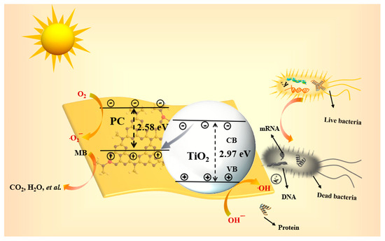 Based on the aforementioned results, Figure 6 presents the diagram of the photocatalytic degradation and antimicrobial mechanism of PC3T. XPS, TEM, etc., demonstrated the existence of better bonding between PC and TiO2 to form a heterogeneous structure. From the perspective of an energy band structure, when PC was combined with TiO2, a Z-type heterojunction was created at their interfaces. Under visible light excitation, both TiO2 and PC generate electrons (e⁻) from the valence band (VB) to the conduction band (CB) and retain holes (h⁺) in the VB. When the two photocatalysts are in close contact, part of the e⁻ of TiO2 can be rapidly transferred to the VB of PC, combining with the h⁺ of PC, and then excited into the CB of PC. The CB of the PC is positioned above the level at which reactive oxygen species are produced, so the e⁻ on the CB of the PC can interact with the O2 adsorbed on the surface to form ·O2−. In addition, the holes in VBs of TiO2 can interact with water or hydroxide ions (OH⁻) to form ·OH [57,58]. Consequently, the produced free radicals could achieve good degradation of MB and antimicrobial effects.