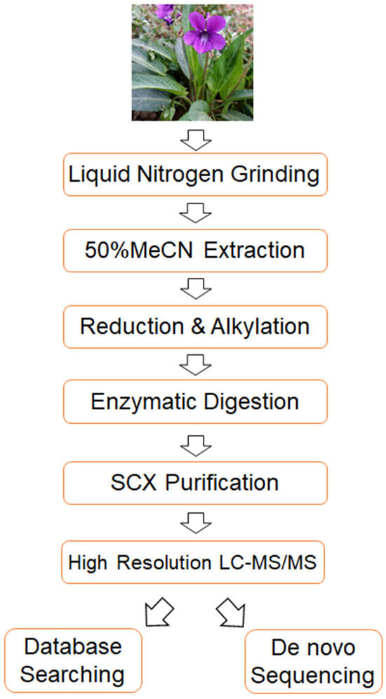 For cyclotide extraction, 50 mg of V. philippica leaves was placed in pre-cooled mortar with liquid nitrogen and ground to a fine powder. Then, the sample was mixed with a four-times-larger volume of lysis buffer (containing 50% acetonitrile and 1% formic acid) and subjected to ultrasonication for lysis [14]. After centrifugation at 4 °C using 12,000× g for 10 min, the supernatant was transferred to a new centrifuge tube, and the concentration was determined using a BCA protein assay kit.