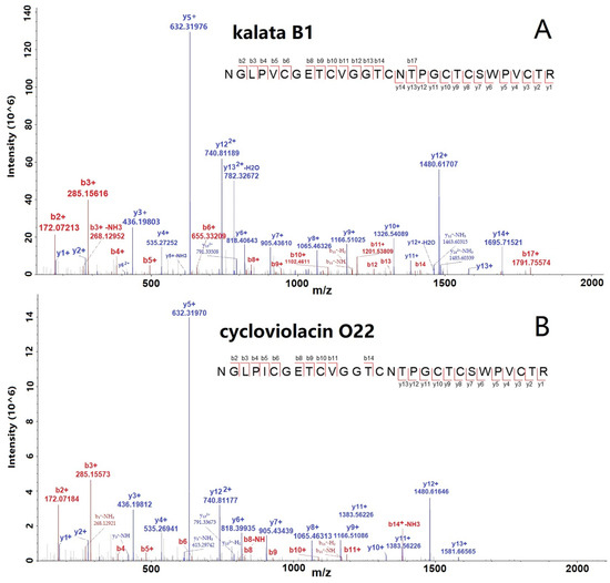 MS/MS spectra of two selected cyclotides, kalata B1 (A) and cycloviolacin O22 (B), identified from V. philippica by using database searching strategy.
