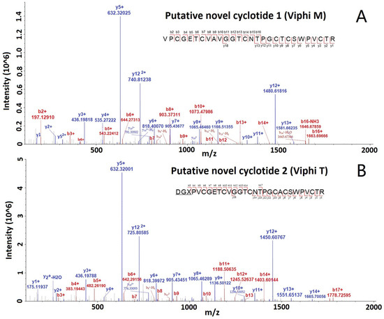 MS/MS spectra of two selected cyclotides, Viphi M (A) and Viphi T (B), identified from V. philippica by using de novo sequencing and database searching-based validation.