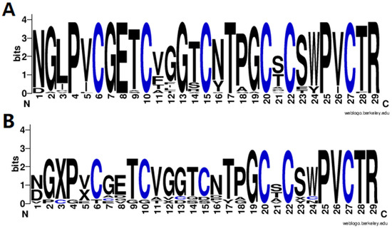 Finally, the amino acid sequence distribution of the identified cyclotides was analyzed using WebLogo3 software [21] to show the diversity of cyclotides in V. philippica, and the results are shown in Figure 4. It can be observed that the cyclotides exhibit a highly conserved distribution of amino acids, including six cysteine residues and amino acids in the other positions. It is obvious that the motif of putative novel cyclotides (Figure 4B) was very similar with that of the known cyclotides from CyBase (Figure 4A), suggesting the reliable identification of novel cyclotides. To further confirm these cyclotides, more validation experiments are needed, including in vitro synthesis and activity testing.