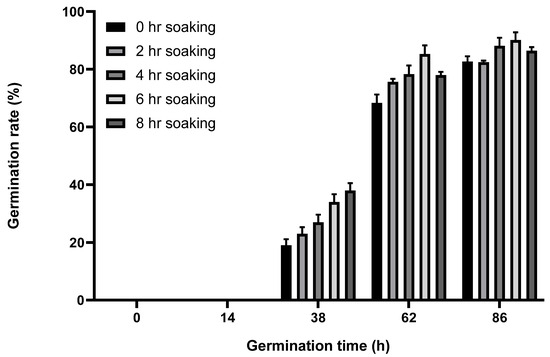 No germination was observed in any of the treatment groups from 0 to 14 h after incubation. However, the germination rate sharply increased in all treatment groups after 14 h and up to 62 h, which was followed by gradual plateauing. All treatment groups exhibited germination rates exceeding 80% by the 86 h mark. The germination rates of the 0 and 2 h soaking treatment groups were 80% and 85%, respectively, at 86 h, whereas those of the 4, 6, and 8 h soaking treatment groups were 91%, 92%, and 90%, respectively, with no statistically significant differences among them. The germination rates of the 4, 6, and 8 h soaking treatment groups were 5–12% higher than those of the 0 and 2 h soaking treatment groups. These results are consistent with those of previous research, such as those of Park (2008) [18], showing that soaking for more than 4 h led to an increase in the germination rate of over 20% compared with that of an unsoaked control group.
