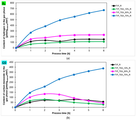 The hydrogen, carbon monoxide and methane contents in the gas phase during the 6 h process, obtained using ethylenediamine-, diethylamine-, and triethylamine-modified titanium dioxide heated in the microwave reactor, are presented in Figure 7a, Figure 7b, Figure 7c, respectively. Additionally, the hydrogen, carbon monoxide and methane contents in the gas phase for the reference material prepared with ammonia water (TTIP_R) have been marked in the same Figures. It is clearly visible that the photoactivity of the studied materials depended on the type of amine used for modification. The highest photoactivity in the photoreduction of carbon dioxide process showed TEA-modified titania, and the highest content of hydrogen (671 μmol/gmaterial/dm3), carbon monoxide (388 mol/gmaterial/dm3) and methane (136 μmol/gmaterial/dm3) was obtained in the gas phase using this photocatalyst. A lower content of appropriate products in the gas phase was noticed for ethylenediamine- and diethylamine-modified titanium dioxide. For ethylenediamine-modified titanium dioxide, 243 μmol/gmaterial/dm3 of hydrogen, 154 μmol/gmaterial/dm3 of CO and 41 μmol/gmaterial/dm3 of CH4 was achieved, while, for diethylamine-modified titanium dioxide, 431 μmol/gmaterial/dm3 of hydrogen, 297 μmol/gmaterial/dm3 of CO and 68 μmol/gmaterial/dm3 of CH4 was obtained. Based on these results, the sample modified with triethylamine has been selected for further studies.