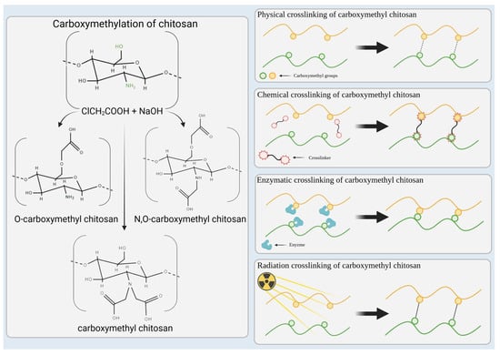 Carboxymethylation and cross-linking methods of chitosan. Carboxymethylation of chitosan is a chemical modification process that produces different derivatives of chitosan. The reaction with ClCH2COOH and NaOH leads to two products, i.e., O-carboxymethyl chitosan and N,O-carboxymethyl chitosan. There are also different types of cross-linking that carboxymethyl chitosan can undergo including physical, chemical, enzymatic, and radiation cross-linking. Each cross-linking method forms connections among the polymer chains, chemical bonds, or interactions based on affinity.