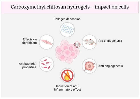 Carboxymethyl chitosan hydrogels—impact on cells. The cellular effects of carboxymethyl chitosan hydrogels include promoting collagen deposition, influencing fibroblasts, stimulating or inhibiting angiogenesis, providing antibacterial properties, and reducing inflammation. These diverse effects highlight the potential of these hydrogels in various biomedical applications, such as tissue engineering, wound healing, and disease treatment.