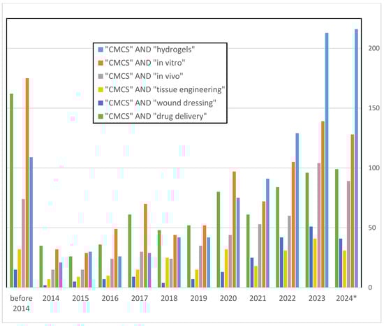 Number of publications on carboxymethyl chitosan indexed in the Scopus database, sourced from publication “title” or “abstract” or “keyword”. The number of publications in the last ten years* and summarized number of publications until 2014, encompassing “carboxymethyl chitosan” and “a specific keyword” of the most exploited hydrogel biomaterial application and biological testing (* in 2024, only 8 months were taken into account for the date of this publication).