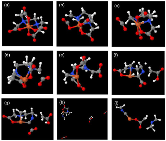 Snapshots of the decomposition trajectory of the Fe(EDTA)− complex. ((a)—0 fs; (b)—1004 fs; (c)—1037 fs; (d)—2166 fs; (e)—2294 fs; (f)—3678 fs; (g)—3699 fs; (h)—4170 fs; (i)—4658 fs).