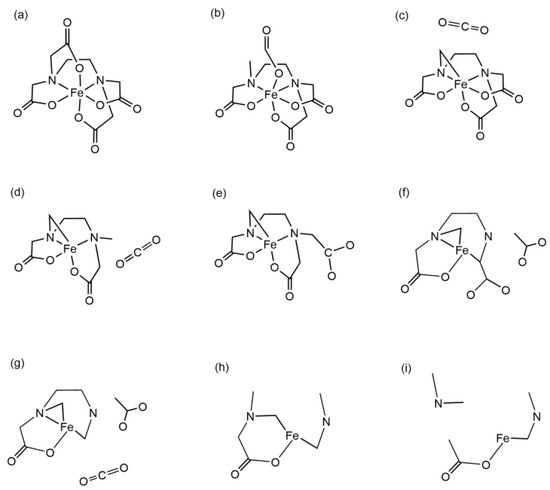 Scheme showing the decomposition reaction of the Fe(EDTA)− complex (the figure order corresponds to that of Figure 3. (a)—0 fs; (b)—1004 fs; (c)—1037 fs; (d)—2166 fs; (e)—2294 fs; (f)—3678 fs; (g)—3699 fs; (h)—4170 fs; (i)—4658 fs).