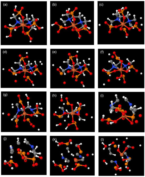 Snapshots of the decomposition trajectory of Fe(EDTMP)− complex. ((a)—0 fs; (b)—2 fs; (c)—13 fs; (d)—15 fs; (e)—21 fs; (f)—39 fs; (g)—49 fs; (h)—61 fs; (i)—73 fs; (j)—80 fs; (k)—200 fs; (l)—400 fs).