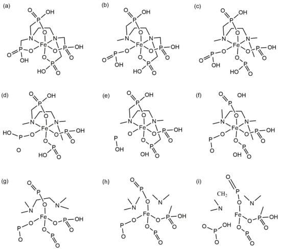 Scheme showing the decomposition reaction of the Fe(EDTMP)− complex (the figure order corresponds to that of Figure 5. (a)—0 fs; (b)—2 fs; (c)—13 fs; (d)—15 fs; (e)—21 fs; (f)—39 fs; (g)—49 fs; (h)—73 fs; (i)—80 fs).