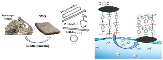 In this study, a solution is proposed to address both issues: textile waste and the presence of heavy metal ions in water. The sorbent was derived from post-industrial textile waste obtained from a local carpet company. Discarded parts of the jute carpet fringes were utilized for the production of a non-woven material suitable for the sorption of heavy metal ions. NWS was manufactured by the needle punch process. In order to enhance its sorption properties for heavy metal ions, NWS was in situ modified with polyaniline (PANI) in the presence of TiO2 nanostructures (Figure 1). PANI is an environmentally friendly, low-cost polymer that is easy to synthesize [12,13,14]. Due to the numerous amino and imino groups present in its structure, PANI exhibits high sorption capacities for metal ions. The lone pair of electrons in the sp3 hybrid orbital of nitrogen can form a coordinate bond with metal ions [12]. To date, vast research has been focused on PANI as a sorbent for heavy metal ions due to simple synthesis routes, tunable morphology, the possibility of chemical regeneration by doping/de-doping, and cheap precursors [15], but PANI nanostructured sorbents are not convenient for practical use as they require additional separation from an aquatic medium. This drawback could be overcome by developing nanocomposites and utilizing its ability to be combined with a variety of polymers, textiles and fillers through in situ polymerization. Many reported studies related to PANI composite materials deal in particular with the removal of cadmium and chrome from water [12,15,16,17,18,19].