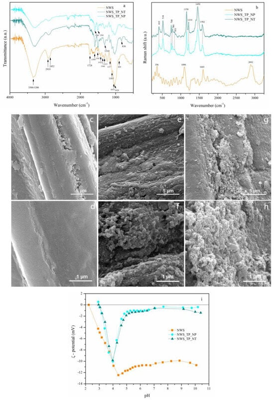 Chemistry, morphology and electrokinetic properties of control and modified NWSs: FTIR spectra of NWS, NWS_TP_NP, and NWS_TP_NT (a), Raman spectra of NWS, NWS_TP_NP, and NWS_TP_NT (b), FESEM micrographs of NWS (c,d), NWS_TP_NP (e,f), and NWS_TP_NT (g,h) under different magnifications (×10,000 and ×50,000), electrokinetic properties of NWS, NWS_TP_NP and NWS_TP_NT (i).