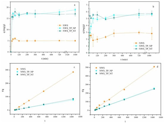 Adsorption kinetics of (a) Pb2+ ions, (b) Cu2+ ions (C0 = 500 mg/L, 20 °C, pH 5.0), and pseudo-second-order plots for the sorption of (c) Pb2+ ions and (d) Cu2+ ions by NWS, NWS_TP_NP, and NWS_TP_NT.
