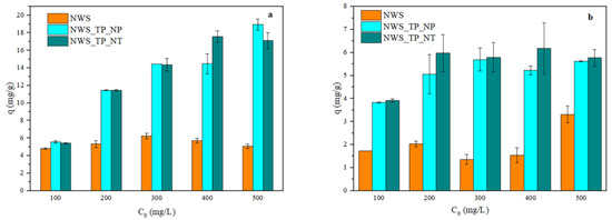 The influence of the initial concentration of metal ions on the sorption capacity of NWS, NWS_TP_NP, and NWS_TP_NT: (a) Pb2+ ions and (b) Cu2+ ions (pH 5.0, 20 °C, 24 h).