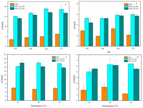 The influence of pH on the sorption of (a) Pb2+ ions and (b) Cu2+ ions (C0 = 500 mg/L, 20 °C, 24 h) and influence of temperature on the sorption of (c) Pb2+ ions and (d) Cu2+ ions (C0 = 500 mg/L, pH 5.0, 60 min) by NWS, NWS_TP_NP, and NWS_TP_NT.