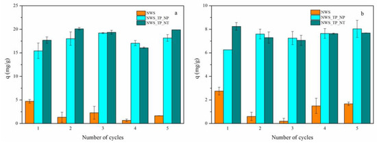 Reusability of NWS, NWS_TP_NP, and NWS_TP_NT for the sorption of (a) Pb2+ ions and (b) Cu2+ ions (C0 = 500 mg/L, 20 °C, pH 5.0, 24 h).