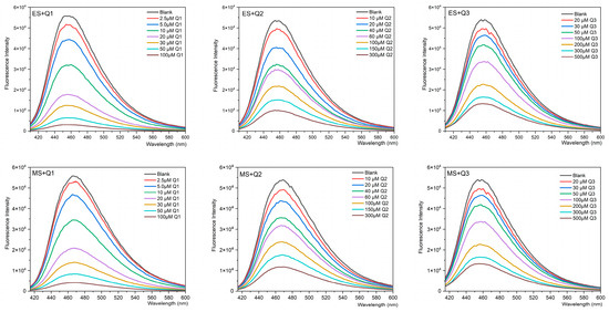Fluorescence quenching curves of ES (8 μM) and MS (5 μM) titrated with different concentrations of the quenchers (Q1–Q3) in PBS (pH 7.2–7.4).