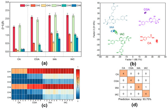 Identification of four phenolic acids by the designed sensor array. (a) The response of the 6-channel sensor array to four phenolic acids (CH = channel); the error bar represents the standard deviation of 6 replications. (b) LDA classical score map of fluorescence response to the 4 phenolic acids obtained by the sensor array (scores were generated by LDA with 95% confidence). (c) Heat map of the fluorescence response of the multichannel array sensor to the four phenolic acids. (d) Confusion matrix plots of 16 unknown samples of the four phenolic acids.