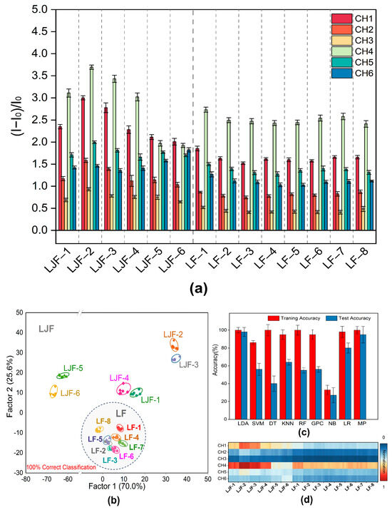 Identification of 14 baches of LJF and LF by the designed sensor array. (a) The response of the 6-channel sensor array to 14 baches of LJF and LF (CH = channel). The error bar represents the standard deviation of 6 tests. (b) LDA classical score plot of fluorescence response for the 14 samples obtained by the sensor array. (c) Heat map of the fluorescence response of the multichannel array sensor to 14 baches of LJF and LF. (d) Accuracy of training and test of the data on fluorescence response of the array sensors for the 14 baches of LJF and LF by 9 machine learning algorithms.