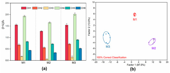 Identification of Jinyinhua mixtures from 3 different manufacturers. (a) The response of the 6-channel sensor array to Jinyinhua mixtures from 3 different manufacturers. (CH = channel); the error bar represents the standard deviation of 6 replications. (b) LDA classical score map of fluorescence response for the Jinyinhua mixtures from 3 different manufacturers obtained by the sensor array.