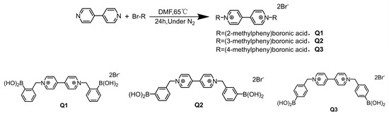 A white solid product (326 mg, yield 86.9%) was obtained by mixing 2-(bromomethyl) phenylboronic acid (345 mg, 1.6 mmol) and 4,4′-bipyridine (100 mg, 0.64 mmol) in 3 mL volume of anhydrous N,N-dimethylformamide. The mixture was stirred at 65 °C in the presence of nitrogen for 24 h, cooled to room temperature, and filtered. Then, the precipitate was washed multiple times with acetone. The synthetic was Q1. The structure of the compound was confirmed as ortho-bromomethyl phenylboronic acid-substituted 4,4′-bipyridinium cations [29] by 1H-NMR (400 MHz, DMSO-d6) δ: 6.16 (4H, s), 7.37 (2H, dd, J = 8.0, 2.0 Hz), 7.48 (4H, m), 7.85 (2H, dd, J = 8.0, 2.0 Hz), 8.75 (4H, d, J = 8.0 Hz), 9.33 (4H, d, J = 8.0 Hz). Q2 and Q3 were synthesized in a similar way by replacing 2-(bromomethyl) phenylboronic acid with 3-(bromomethyl) phenylboronic acid and 4-(bromomethyl) phenylboronic acid, respectively. Figure 6 depicts the pathway of synthesis of Q1–Q3.
