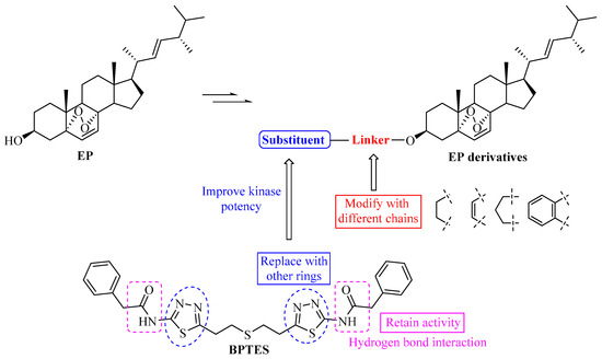 BPTES was the first reported small-molecule inhibitor of GLS1 with a symmetrical structure consisting of thiadiazole, amide, and phenyl [33,34,35]. A large number of derivatives that significantly inhibited GLS1 had been synthesized in structural derivatization studies based on the skeleton structure of BPTES [36,37,38]. A structure–activity relationship analysis showed that the amide group was an important pharmacophore for binding and that the thiadiazole group at its end could be replaced with a variety of substituents, without affecting the GLS1-inhibitory activity of the compound [39]. The benzene ring also featured a large space for modification [40]. Based on the idea of molecular hybridization, important groups or substituents from the structure of BPTES and its derivatives were introduced into EP by us to improve the antitumor and enzyme-inhibitory activities of EP derivatives. At the same time, it was also considered by us that the introduction of large sterically hindered groups into the C-3 hydroxyl group of EP might have decreased its biological activity. Therefore, different linkers with varying lengths and structures were designed by us to connect EP and BPTES substituents and the influence of the chemical space on the derivatives’ biological activities was examined. The structural design strategy for the new EP derivative is shown in Figure 1.