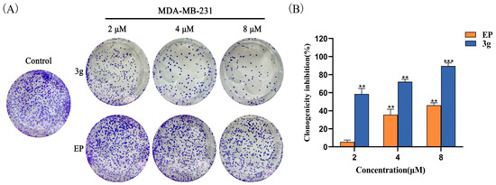 MDA-MB-231 cells (1000 cells/well) were seeded into a 6-well plate with 2 mL L–15 culture medium and incubated at 37 °C for 24 h. Following this process, different concentrations of 3g or EP were added and incubated for an additional 24 h before the culture medium was replaced. The cells then continued to be cultured for two weeks, with the culture medium being changed twice a week. After two weeks, the cell colonies were washed with PBS, fixed using a 4% paraformaldehyde solution (Beyotime, Shanghai, China), and subsequently stained with a 0.05% crystal violet solution (Beyotime, Shanghai, China).