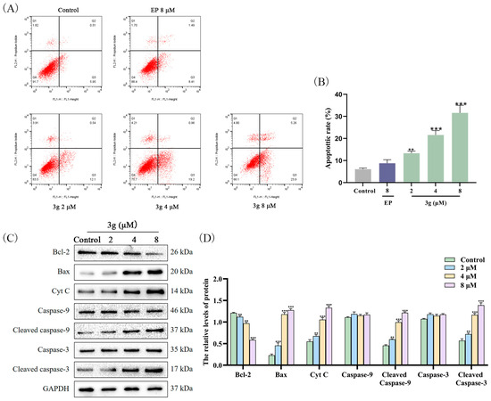 Compound 3g induced apoptosis of MDA-MB-231 cells. (A) MDA-MB-231 cells were treated with different concentrations of 3g for 48 h; then, the cells were fixed and stained with Annexin V-FITC/PI and analyzed via flow cytometry. Annexin V-FITC and PI data are expressed as percentages (%) for each quadrant. (B) The apoptosis rate was quantitatively detected. (C) Western blot analysis. MDA-MB-MB-231 cells were treated with different concentrations of 3g for 48 h, and the protein expressions of Bcl-2, Bax, Cyt C, caspase-9, cleaved caspase-9, caspase-3, and cleaved caspase-3 were detected via Western blot. (D) Quantitative analysis. Data represent the means ± SD (n = 3), ** p < 0.01, *** p < 0.001, compared with the control group.
