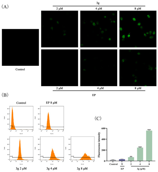 Compound 3g induced an increase in the ROS levels in MDA-MB-231 cells. MDA-MB-231 cells were subjected to treatment with 3g and EP at different concentrations for 48 h. (A) Fluorescence microscopy image of intracellular ROS production in MDA-MB-231 cells stained with DCFH-DA (green). (B) Quantification of ROS levels by flow cytometry. (C) Quantitative analysis. Data represent the means ± SD (n = 3), ** p < 0.01, *** p < 0.001, compared with the control group.