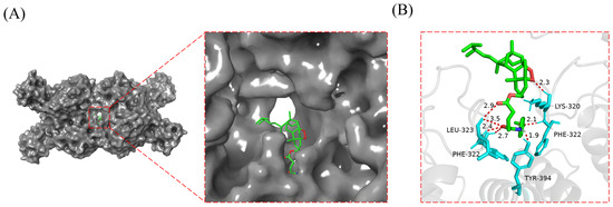 GLS1 usually exists as a dimer or tetramer, where the tetramer is catalytically active and the dimer is inactive. The tetramer is structurally composed of four molecules with an asymmetric unit characterized by two sets of interfaces. In order to investigate the binding mode of compound 3g with GLS1, molecular docking studies were carried out based on the crystal structure of GLS1 (PDB: 3UO9), and it was found that 3g interacts with different reaction sites in the allosteric pocket of GLS1 (Figure 7). The amino acid residues TRY-394, PHE-322, and LEU-323 form hydrogen bonding connections with the amide and ester groups in compound 3g. This hydrogen bonding interaction drives the linker and substituent deep into the narrow cavity of the GLS1 tetramer, which in turn orients 4-methoxyaniline to the other reactive site to form a hydrogen bonding interaction with PHE-322. At the same time, the peroxy bridge in EP also forms a hydrogen bonding interaction with LYS-320. All these interactions help to stabilize the conformation and assembly of the ligand in the new site of the GLS1 allosteric pocket. Notably, the binding energy of the protein–ligand complex reached –10.79 kcal/mol, which was a good indication of the good inhibitory activity of compound 3g toward GLS1.