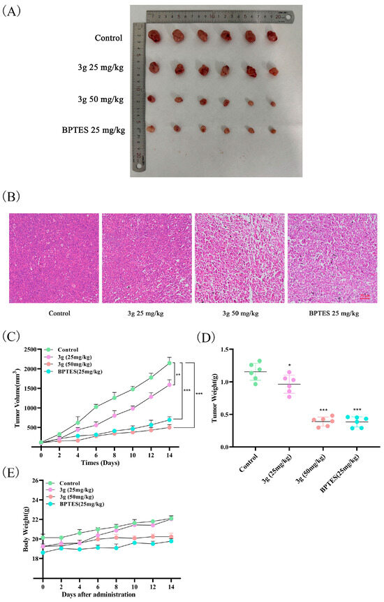 Compound 3g inhibited the growth of 4T1 cells in vivo. (A) Tumor images of 4T1 tumor-bearing mice treated with 3g or BPTES; and (B) tumor HE staining. Scale = 50 μm. (C) Changes in the tumor volume; (D) tumor weight; and (E) body weight of 4T1 tumor-bearing mice. Data represent the mean ± SD (n = 6), * p < 0.05, ** p < 0.01, *** p < 0.001, compared with the control group. Scale = 50 μm.