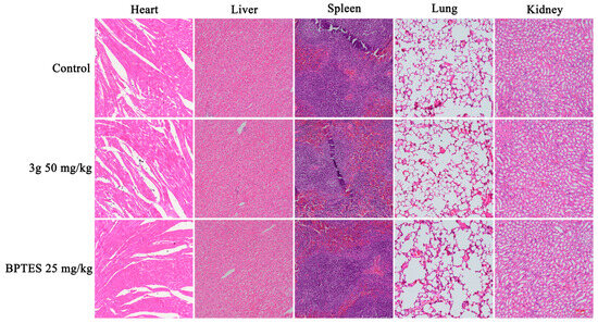 To more deeply investigate the antitumor activity of compound 3g in vivo, 4T1 cells were injected subcutaneously into BALB/c mice by us to successfully establish a mouse-transplanted tumor model. The mice were treated with 3g (25 and 50 mg/kg/2 days) and BPTES (25 mg/kg/2 days) until they were euthanized on the 14th day. Then, the mice’s organs were collected for histopathological analysis. The tumor growth in the 3g treatment group was effectively inhibited compared with that in the blank control group, as shown in Figure 8A,B. After 3g treatment, both the tumor volume and the tumor weight were significantly reduced (Figure 8C,D). Additionally, compound 3g had no significant effect on the body weights of the mice throughout the experimental treatment period, with no obvious signs of adverse reactions (Figure 8E). To explore the impact of 3g on organ damage, we used the HE staining method to observe the changes in the heart, liver, spleen, lungs, and kidneys. In the tumor-bearing mouse group treated with 3g, no histopathological changes were detected in these organs, clearly indicating the absence of significant toxicity under the current treatment method (Figure 9). These results fully demonstrate that 3g can effectively inhibit the proliferation of tumors in model mice without obvious toxicity to other organs.
