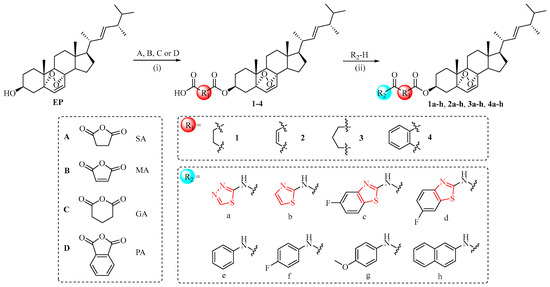 Synthesis of EP derivatives (1a–h, 2a–h, 3a–h, and 4a–h). Reagents and conditions: (i) Et3N, CH2Cl2, SA (A), MA (B), GA (C), or PA (D), reflux, 24 h, 76–85%; and (ii) R2-H, HOBT·H2O, EDCI·HCl, pyridine, DMF, room temperature, 12–48 h, 77–88%.