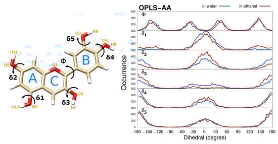 Planarity in CYD is indicative of a good degree of delocalization/conjugation in benzopyrylium that also extends to the 2-phenyl ring [83], which directly reflects on the anthocyanidins absorption spectra (vide infra). Many researchers agree with the quasi-planarity of the molecule [52,56,59,84,85,86,87,88,89], consistent with reported X-ray crystal studies [90]. Figure 1 (right) illustrates the dihedral distribution functions (DDFs) for the main torsions of CYD as dissolved in water (blue) and ethanol (red). The distribution of the dihedral, which defines the position of the polyphenol ring with respect to the fused rings, is shown in the top panel. Such a dihedral angle is directly related to the planarity of the molecule. By using OPLS-AA FF, CYD does not undergo strong structural modifications, and the four groups of conformers (as related to dihedral angle) sampled during the MD agree with the quasi-coplanarity of the benzopyrylium and the 2-phenyl rings mentioned above. Remarkably, our DDFs of resemble the four-peak distributions resulting from accurate ab initio MD simulations for cyanidin-3-glucoside (cyanin) in explicit water [65]. Conversely, the set of parameters derived with the GAFF force field induces a partial distortion of the CYD molecule and a remarkable rotation of the catechol ring with dihedral values of around −90º and 90º in water and ethanol, respectively, as seen in Figure S1 in the Supplementary Material (SM). This demonstrates that the geometries (and consequently the optical properties) of natural dyes like CYD may dramatically depend on the choice of the FF.