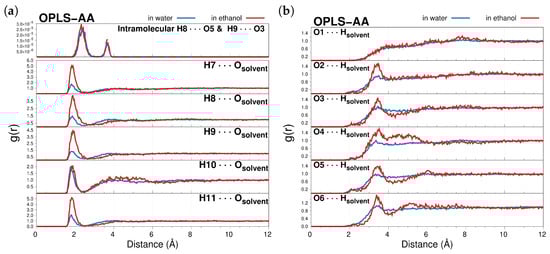 By analyzing the RDFs, it is possible to obtain a deeper understanding of the CYD atoms that are more prone to be involved in HBs with the solvent. The position of the RDFs maxima and the corresponding running coordination numbers (RCNs) resulting from their integration over the first solvation shell are listed in Table 1 and give ≈5 water and ≈4 ethanol molecules close to CYD and mostly located around the CYD hydroxyl groups (see also Figure S2 in the Supplementary Materials). Notice that peaks in the RDF plots when the CYD oxygens act as acceptors (see Figure 2b) barely appear in the second solvation shell, which is in agreement with the findings reported in ref. [64]. This can be interpreted as a case where the dye acts better as a proton donor in solution. Furthermore, the RDF peaks for Hi Osolvent pairs in ethanol are always found at slightly longer distances with respect to the water ones, thus highlighting stronger interactions between CYD⋯solvent in an aqueous solution. RCNs for H8 and H9 (see Table 1) in conjunction with the intramolecular atom–atom pair correlation functions shown in the top panel of Figure 2a suggest that the competitive intra- and intermolecular interactions are inclined towards contact between the solvents. Therefore, even weak interactions between CYD and solvent molecules or, in less diluted solutions, between CYD molecules as well, can alter the equilibrium value of the dihedral angle and influence CYD hues [59]. Results obtained using the GAFF FF provide a picture of the chromophore interacting more weakly with both solvents (see Figures S3 and S4 and Table S1 in the Supplementary Materials).
