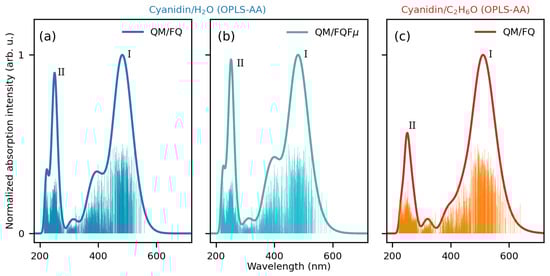 Figure 3 displays the final modeled spectra of CYD in water and ethanol, collected after averaging 200 individual spectra corresponding to instantaneous configurations of the fully solvated system. The convergence analysis of the computed spectra as a function of the number of snapshots is reported in Figures S8 and S9 in the Supplementary Materials. As stated above, the absorption spectrum in aqueous solution is computed at the QM/FQ and QM/FQF levels, while that in ethanol is calculated at the QM/FQ level only. Figure 3 reports the computed stick spectra (raw data) for each snapshot. The spread of the sticks clearly shows the natural origin of the inhomogeneous band broadening (convoluted line), which is automatically taken into account by the dynamic sampling of the solute–solvent phase space. Notably, the sticks in ethanol feature a broader distribution and, in turn, a broader absorption band with respect to the spectra in aqueous solution.