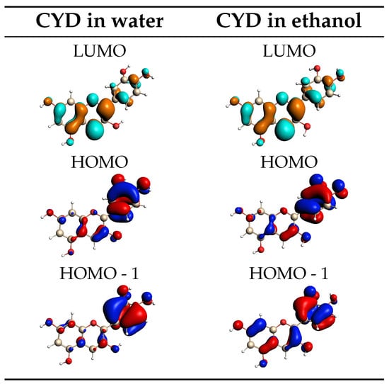 To characterize the electronic transitions, relevant molecular orbitals (MOs) of CYD in water and in ethanol are shown in Figure 4, as calculated for the most representative structure extracted from the trajectory (vide infra). The frontier orbitals of the system have a character and are mainly delocalized over the benzopyrylium and catechol rings since the anthocyanidin core is a fully delocalized -conjugated system, which is why these compounds can absorb visible light [68]. An MO rationalization of the main band that appears in the experimental spectra indicates that it is determined by the transition, which is essentially a HOMO-LUMO transition of character, accounting for around 95% and 96% of the total oscillator strength in water and ethanol, respectively. The shoulder of the maximum absorption band, located at around 400 nm, corresponds to the transition to the second excited state () and is mainly assigned to the HOMO-1 → LUMO transition. This assignment of the electronic transitions is in line with the findings reported in other works [56,60,61,88]. The similarities found in the MOs and hydration patterns of CYD in water and ethanol are thus reflected in the same shape of the spectral profiles. It is also worth remarking that, by using the structures extracted from GAFF MD runs, as expected, the outlined picture is completely different for the aforementioned discrepancies in the sampling of the solute conformational space (see Figure S13 in the Supplementary Materials).