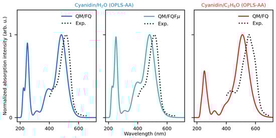 Let us now move to compare our computed results with the experimental results recovered from ref. [96]. From the experimental point of view, anthocyanidins generally present two main absorption bands in the UV/visible spectrum. The first is observed in the 270–280 nm range (band II), while the second is in the 465–560 nm range (band I) both in alcoholic solution and in the presence of hydrochloric acid. A third small-intensity band peaking at 310–360 nm has also been reported [58,85]. Although the three bands of anthocyanidins are all captured in our modeled spectra, we focus our attention on the main peak located in the visible region. A critical assessment of available spectroscopic data for CYD and its glycosylated compound, namely cyanin, showed that several independent measurements of are available in hydrochloric acid in methanol, water, and ethanol as solvents. Likewise, depending on the approaches in the modeling, diverse results from calculations are available as well. The gathering of such data is listed in Table S3 in the Supplementary Materials. Summarizing the findings reported in ref. [96], the absorption spectrum for the CYD (and cyanin molecule) in water solution at room temperature displays a broad band all over the visible range, characterized by two prominent peaks at 512 and 429 nm. Regardless of the solvent, our results are in good agreement with experiments both in the shape and in the position of the lowest energy peaks when configurations come from MDs with OPLS-AA FF (the molecule is quasi-planar).