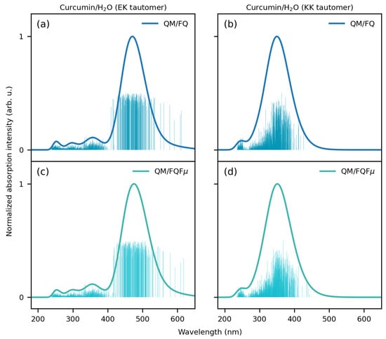 Stick and convoluted (normalized) spectra of solvated EK (left) and KK (right) tautomers of curcumin dissolved in water as computed at the QM/FQ (a,b) and QM/FQF (c,d) levels.